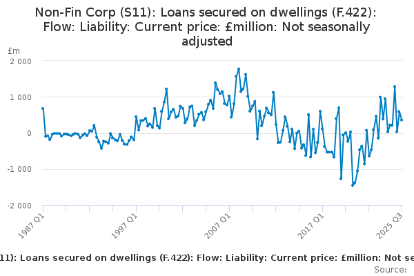 Download this time seriesNon-Fin Corp (S11): Loans secured on dwellings (F.422): Flow: Liability: Current price: £million: Not seasonally adjusted