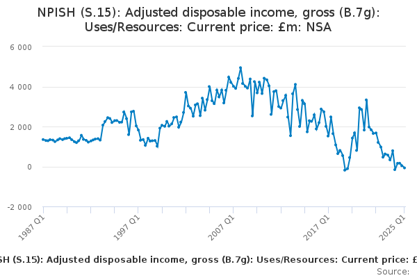 Download this time seriesNPISH (S.15): Adjusted disposable income, gross (B.7g): Uses/Resources: Current price: £m: NSA