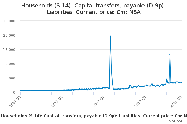 Download this time seriesHouseholds (S.14): Capital transfers, payable (D.9p): Liabilities: Current price: £m: NSA