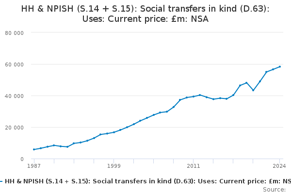 Download this time seriesHH & NPISH (S.14 + S.15): Social transfers in kind (D.63): Uses: Current price: £m: NSA