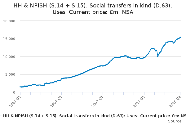 Download this time seriesHH & NPISH (S.14 + S.15): Social transfers in kind (D.63): Uses: Current price: £m: NSA