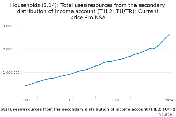 Download this time seriesHouseholds (S.14): Total uses/resources from the secondary distribution of income account (T.II.2: TU/TR): Current price:£m:NSA