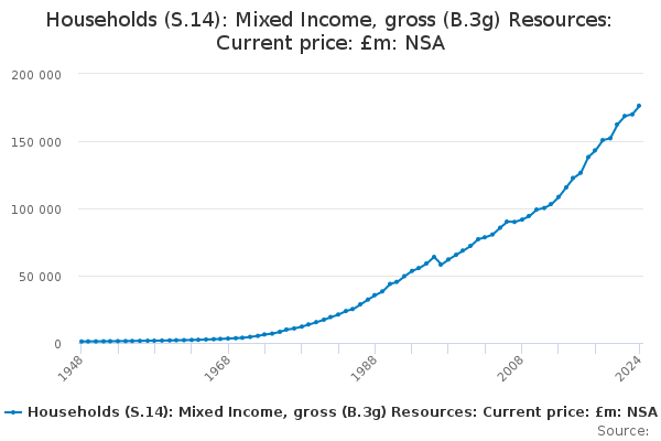 Download this time seriesHouseholds (S.14): Mixed Income, gross (B.3g) Resources: Current price: £m: NSA