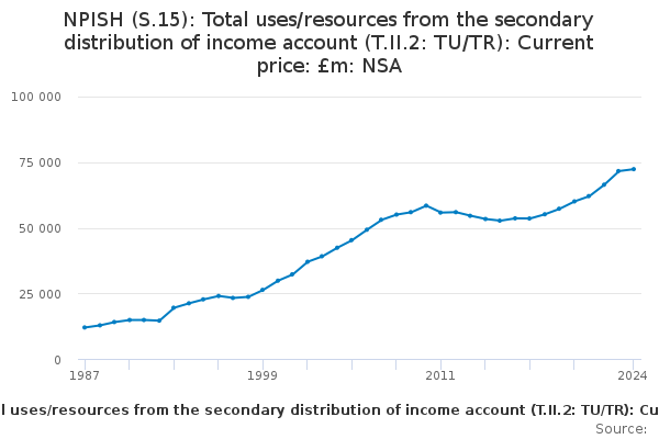 Download this time seriesNPISH (S.15): Total uses/resources from the secondary distribution of income account (T.II.2: TU/TR): Current price: £m: NSA