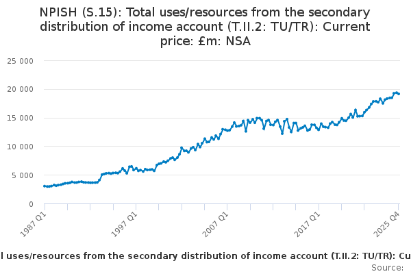 Download this time seriesNPISH (S.15): Total uses/resources from the secondary distribution of income account (T.II.2: TU/TR): Current price: £m: NSA