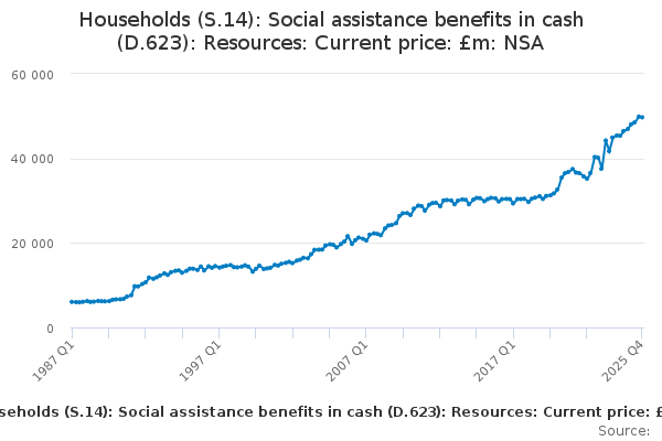 Download this time seriesHouseholds (S.14): Social assistance benefits in cash (D.623): Resources: Current price: £m: NSA