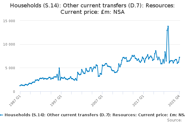 Download this time seriesHouseholds (S.14): Other current transfers (D.7): Resources: Current price: £m: NSA
