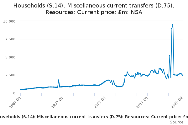 Download this time seriesHouseholds (S.14): Miscellaneous current transfers (D.75): Resources: Current price: £m: NSA