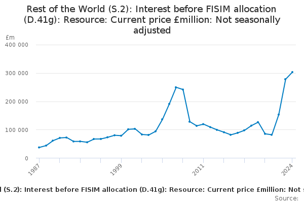 Download this time seriesRest of the World (S.2): Interest before FISIM allocation (D.41g): Resource: Current price £million: Not seasonally adjusted