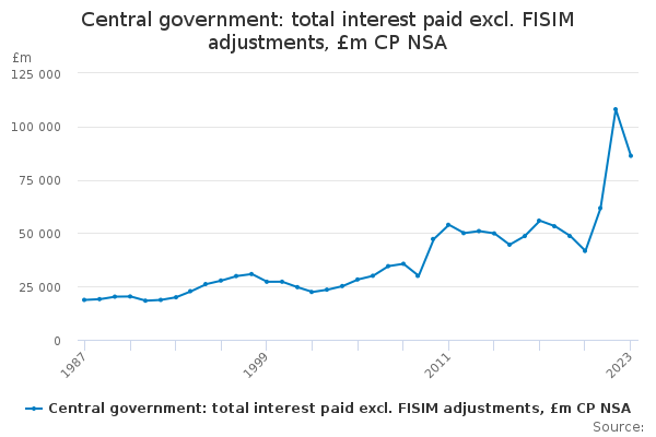 Download this time seriesCentral government: total interest paid excl. FISIM adjustments, £m CP NSA
