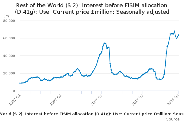 Download this time seriesRest of the World (S.2): Interest before FISIM allocation (D.41g): Use: Current price £million: Seasonally adjusted