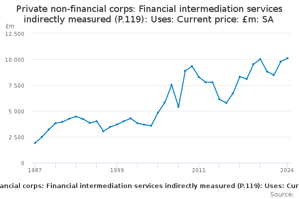 Download this time seriesPrivate non-financial corps: Financial intermediation services indirectly measured (P.119): Uses: Current price: £m: SA