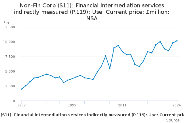 Download this time seriesNon-Fin Corp (S11): Financial intermediation services indirectly measured (P.119): Use: Current price: £million: NSA