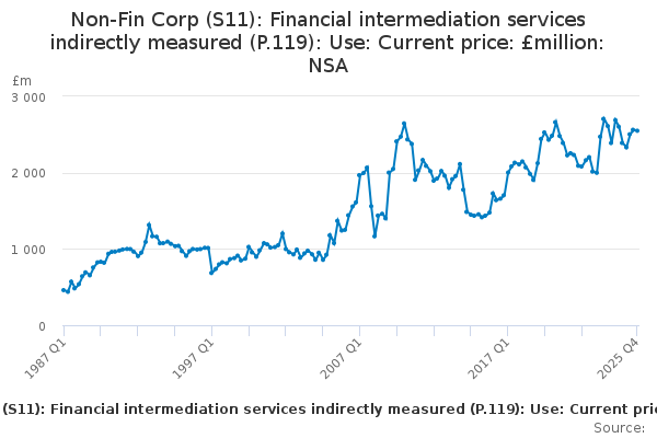 Download this time seriesNon-Fin Corp (S11): Financial intermediation services indirectly measured (P.119): Use: Current price: £million: NSA