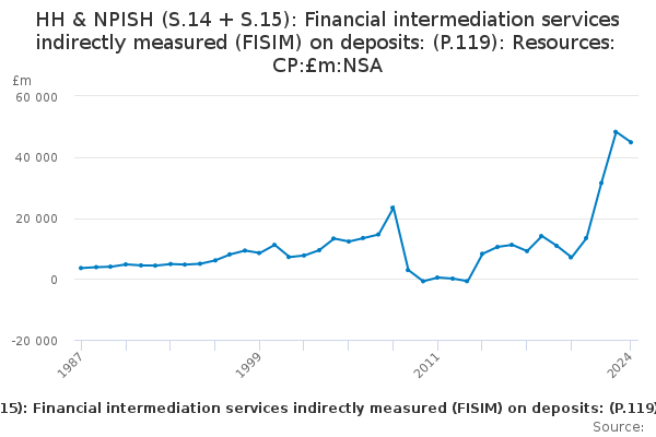 Download this time seriesHH & NPISH (S.14 + S.15): Financial intermediation services indirectly measured (FISIM) on deposits: (P.119): Resources: CP:£m:NSA