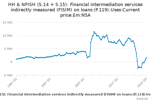 Download this time seriesHH & NPISH (S.14 + S.15): Financial intermediation services indirectly measured (FISIM) on loans:(P.119):Uses:Current price:£m:NSA