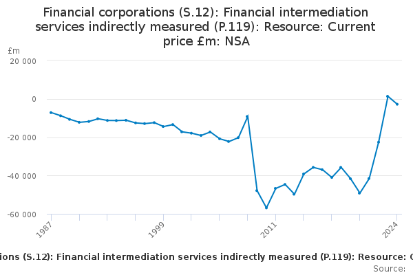 Download this time seriesFinancial corporations (S.12): Financial intermediation services indirectly measured (P.119): Resource: Current price £m: NSA