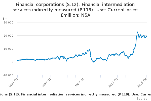 Download this time seriesFinancial corporations (S.12): Financial intermediation services indirectly measured (P.119): Use: Current price £million: NSA
