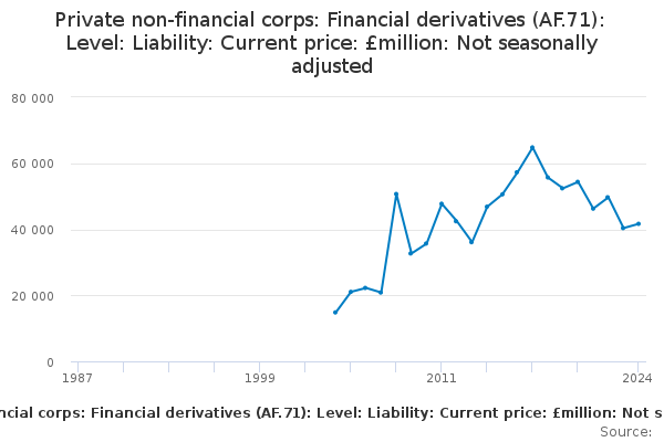 Download this time seriesPrivate non-financial corps: Financial derivatives (AF.71): Level: Liability: Current price: £million: Not seasonally adjusted