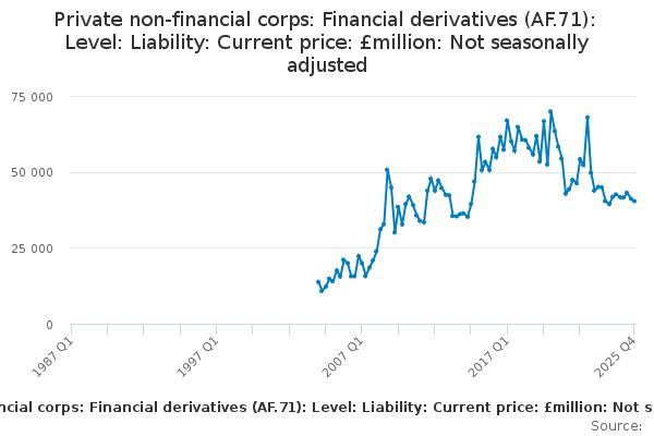 Download this time seriesPrivate non-financial corps: Financial derivatives (AF.71): Level: Liability: Current price: £million: Not seasonally adjusted