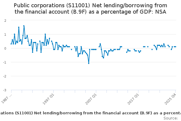 Download this time seriesPublic corporations (S11001) Net lending/borrowing from the financial account (B.9F) as a percentage of GDP: NSA