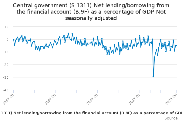 Download this time seriesCentral government (S.1311) Net lending/borrowing from the financial account (B.9F) as a percentage of GDP Not seasonally adjusted