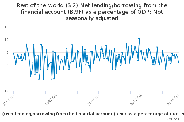 Download this time seriesRest of the world (S.2) Net lending/borrowing from the financial account (B.9F) as a percentage of GDP: Not seasonally adjusted