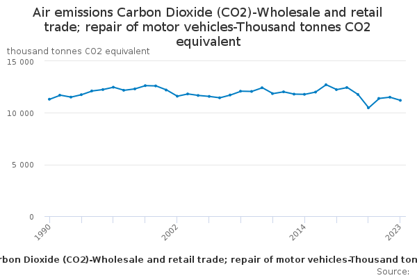 Download this time seriesAir emissions Carbon Dioxide (CO2)-Wholesale and retail trade; repair of motor vehicles-Thousand tonnes CO2 equivalent