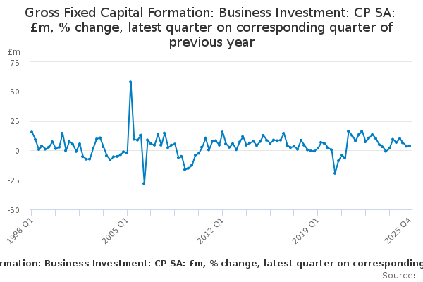 Download this time seriesGross Fixed Capital Formation: Business Investment: CP SA: £m, % change, latest quarter on corresponding quarter of previous year