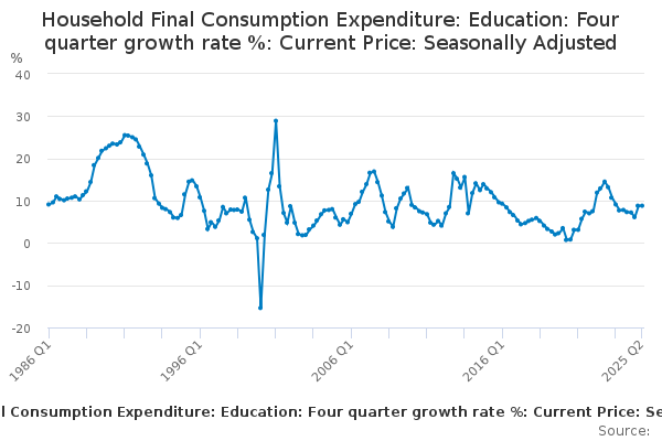 Download this time seriesHousehold Final Consumption Expenditure: Education: Four quarter growth rate %: Current Price: Seasonally Adjusted