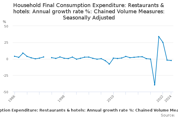 Download this time seriesHousehold Final Consumption Expenditure: Restaurants & hotels: Annual growth rate %: Chained Volume Measures: Seasonally Adjusted