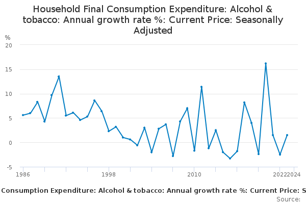 Download this time seriesHousehold Final Consumption Expenditure: Alcohol & tobacco: Annual growth rate %: Current Price: Seasonally Adjusted