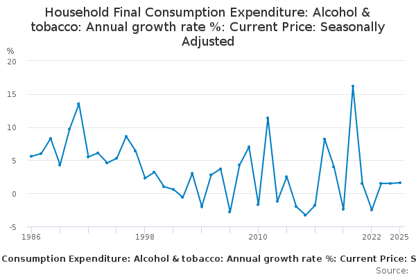 Download this time seriesHousehold Final Consumption Expenditure: Alcohol & tobacco: Annual growth rate %: Current Price: Seasonally Adjusted