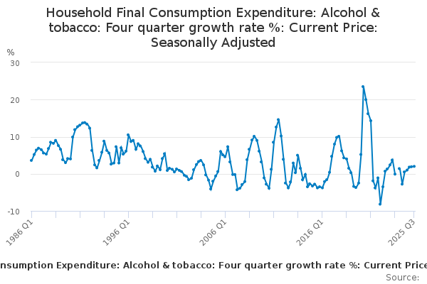 Download this time seriesHousehold Final Consumption Expenditure: Alcohol & tobacco: Four quarter growth rate %: Current Price: Seasonally Adjusted