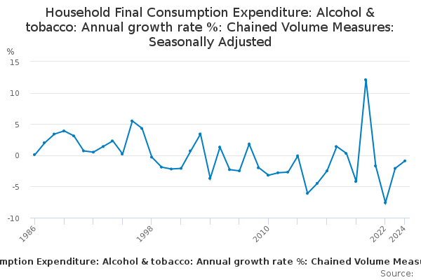 Download this time seriesHousehold Final Consumption Expenditure: Alcohol & tobacco: Annual growth rate %: Chained Volume Measures: Seasonally Adjusted