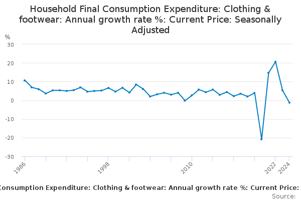 Download this time seriesHousehold Final Consumption Expenditure: Clothing & footwear: Annual growth rate %: Current Price: Seasonally Adjusted