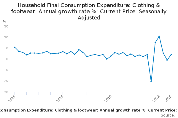 Download this time seriesHousehold Final Consumption Expenditure: Clothing & footwear: Annual growth rate %: Current Price: Seasonally Adjusted