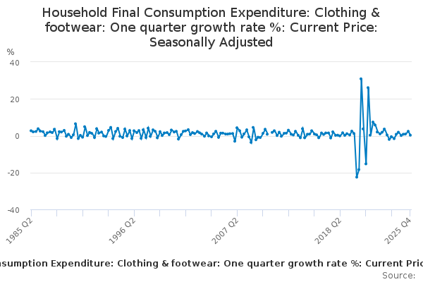 Download this time seriesHousehold Final Consumption Expenditure: Clothing & footwear: One quarter growth rate %: Current Price: Seasonally Adjusted