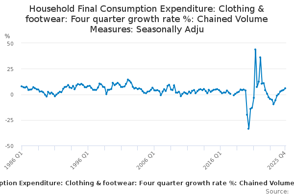 Download this time seriesHousehold Final Consumption Expenditure: Clothing & footwear: Four quarter growth rate %: Chained Volume Measures: Seasonally Adju