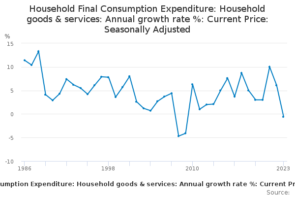 Download this time seriesHousehold Final Consumption Expenditure: Household goods & services: Annual growth rate %: Current Price: Seasonally Adjusted