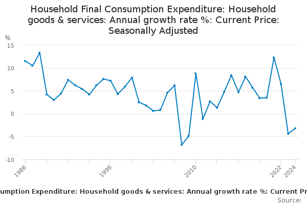 Download this time seriesHousehold Final Consumption Expenditure: Household goods & services: Annual growth rate %: Current Price: Seasonally Adjusted