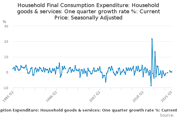 Download this time seriesHousehold Final Consumption Expenditure: Household goods & services: One quarter growth rate %: Current Price: Seasonally Adjusted
