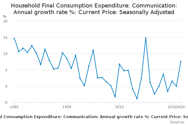 Download this time seriesHousehold Final Consumption Expenditure: Communication: Annual growth rate %: Current Price: Seasonally Adjusted