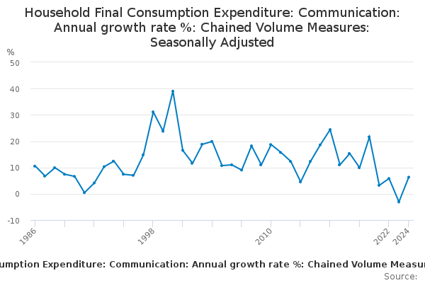 Download this time seriesHousehold Final Consumption Expenditure: Communication: Annual growth rate %: Chained Volume Measures: Seasonally Adjusted