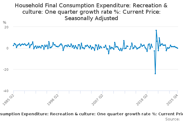 Download this time seriesHousehold Final Consumption Expenditure: Recreation & culture: One quarter growth rate %: Current Price: Seasonally Adjusted