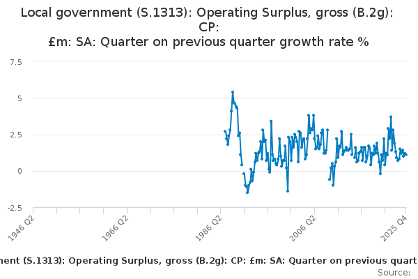 Download this time seriesLocal government (S.1313): Operating Surplus, gross (B.2g): CP: £m: SA: Quarter on previous quarter growth rate %