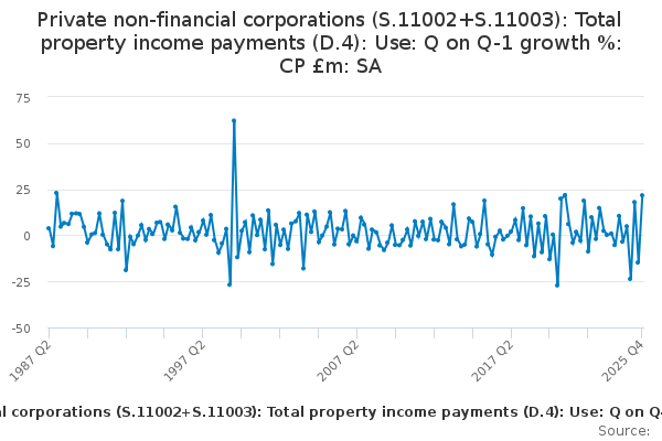 Download this time seriesPrivate non-financial corporations (S.11002+S.11003): Total property income payments (D.4): Use: Q on Q-1 growth %: CP £m: SA