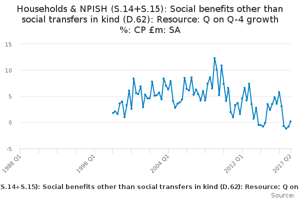Download this time seriesHouseholds & NPISH (S.14+S.15): Social benefits other than social transfers in kind (D.62): Resource: Q on Q-4 growth %: CP £m: SA