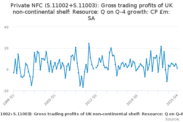 Download this time seriesPrivate NFC (S.11002+S.11003): Gross trading profits of UK non-continental shelf: Resource: Q on Q-4 growth: CP £m: SA
