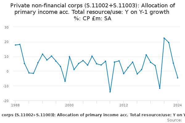 Download this time seriesPrivate non-financial corps (S.11002+S.11003): Allocation of primary income acc. Total resource/use: Y on Y-1 growth %: CP £m: SA